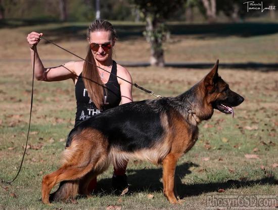 A powerful and rangy female standing on the maximum size with correct development for her age. She is slightly elongated in the body and the croup should be longer. She should stand more correct in front. She stands in the image of her excellent mother, Sansaa.